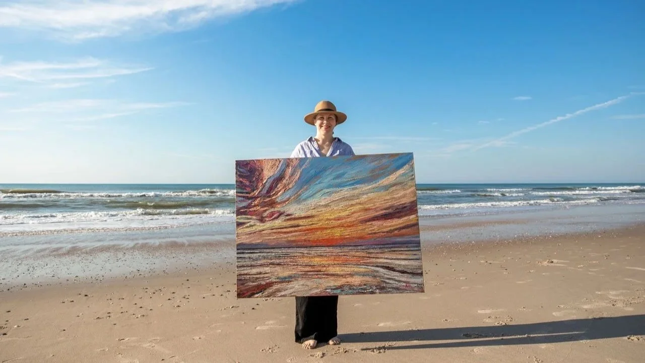 I paint dreamy marshes, luminous coastal skies, and expressive florals with a signature style I call Imperfectionism. It’s my personal blend of intentional mark-making, bold texture, fluid movement, and the kind of “happy accidents” that remind us we’re human — and that imperfection is where the soul lives.
